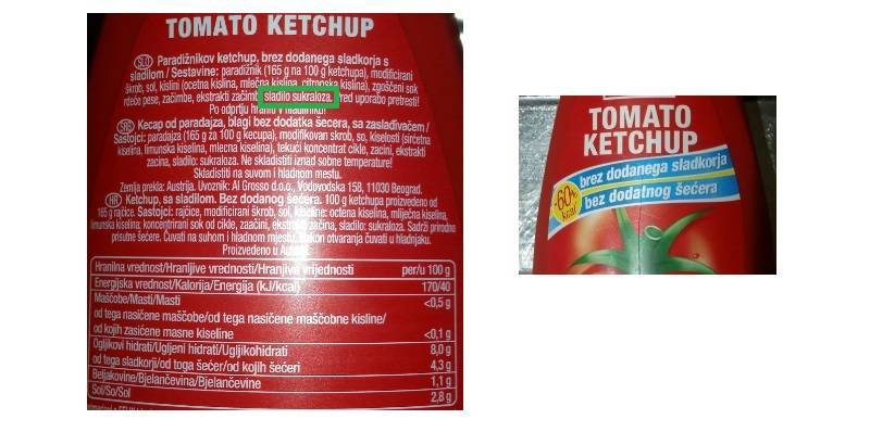Proizvajalec je ime izdelka zapisal le na deklarciji - Paradižnikov ketchup, brez sladkorja s sladilom, ki mu sledi seznam sestavin. Teoretično torej proizvajalec ne krši zakonodaje, čeprav potrošnikom lahko daje misliti, da izdelek ne sladkorja ali drugih sladil.