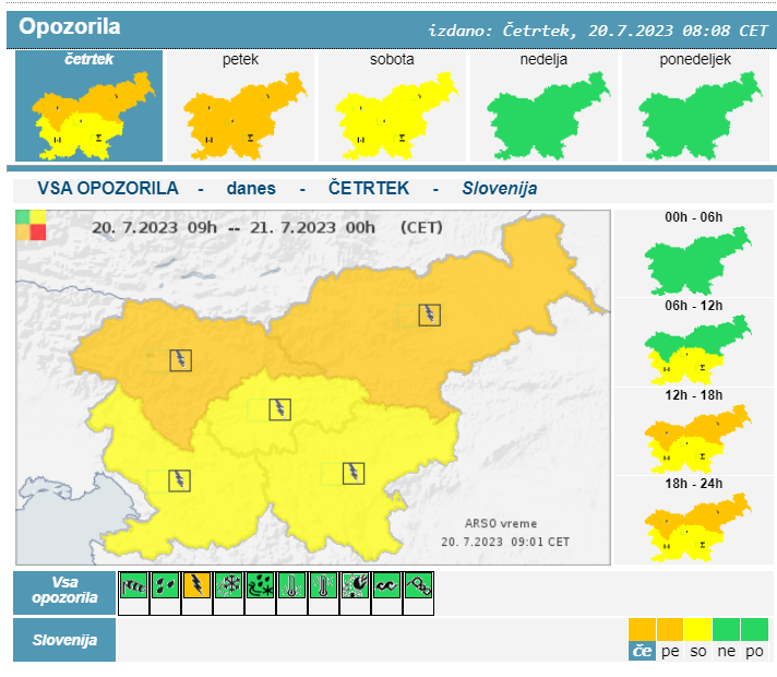 Agencija Republike Slovenije za okolje je tudi za danes izdala oranžno opozorilo, popoldne nas zopet čakajo močnejše nevihte.
