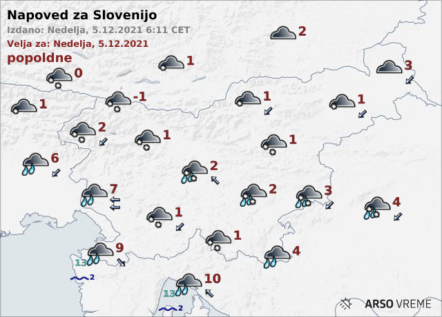 Ponoči bodo padavine ponehale, na zahodu se bo proti jutru že jasnilo. Po nekaterih nižinah bo megleno. Jutranje temperature bodo od -5 do 1, na Primorskem od 2 do 6 stopinj Celzija.