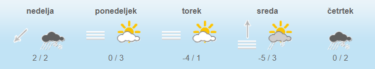 Na Primorskem bo zapihala šibka burja, na Štajerskem in v Prekmurju pa severovzhodni veter. Temperature bodo od -1 do 4, na Primorskem od 5 do 9 stopinj Celzija.