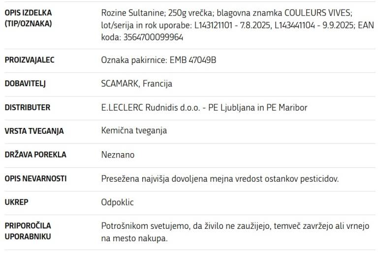 Uprava za varno hrano, veterinarstvo in varstvo rastlin je bila s strani podjetja E.LECLERC obveščena o odpoklicu rozin sultanin.