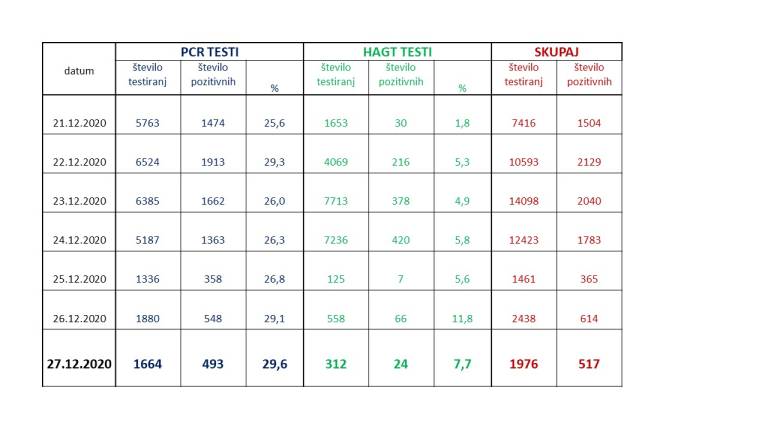 - Jutri (29. 12.) je testiranje organizirano v Kopru, Slovenj Gradcu, Cerkljah, v Zagorju ob Savi, v Medvodah, v Pivki, v Postojni, v Ilirski Bistrici, v Sežani, v Podčetrtku in v Črnomlju.