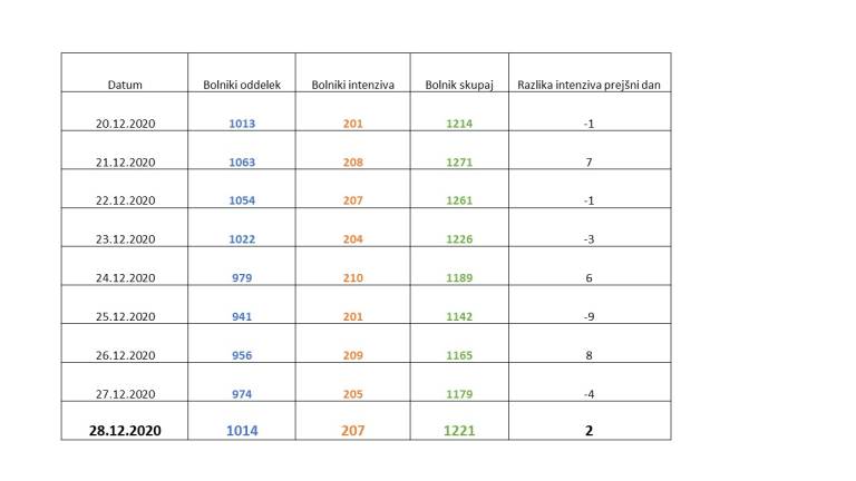 Včeraj je bilo iz bolnišnične oskrbe odpuščenih 38 covid pacientov, v bolnišnice pa je bilo skupaj sprejetih 98 oseb. Skupaj je bilo minuli vikend v bolnišnice sprejetih 174 oseb, medtem ko je bilo skupaj čez vikend odpuščenih 75 pacientov.