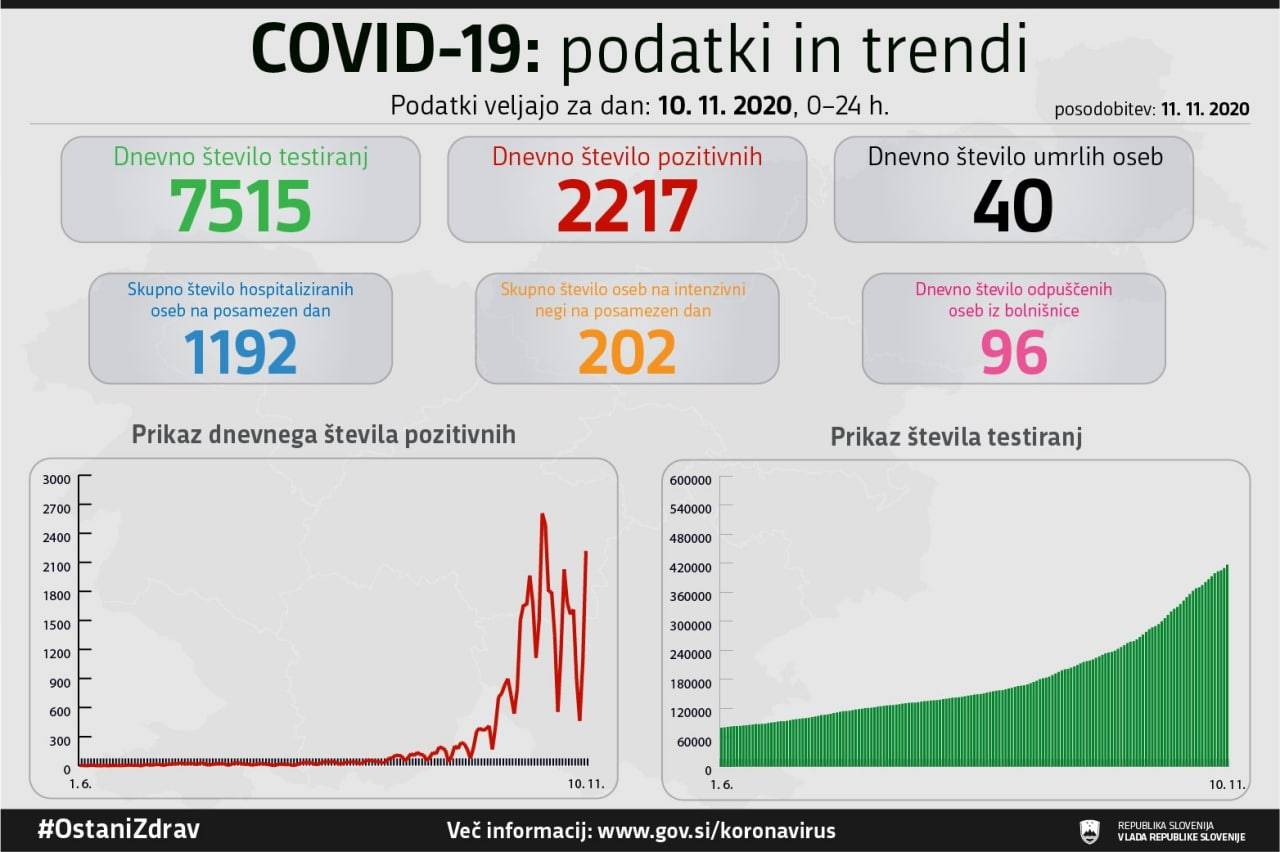 V Sloveniji so v včeraj, 10. novembra, opravili 7515 testiranj na koronavirus in potrdili 2217 novih okužb, delež pozitivnih je bil 29,50 odstotka vseh testiranih.