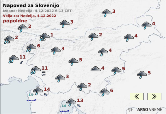 Najvišje dnevne temperature bodo od 1 do 6 na Primorskem od 9 do 14 stopinj Celzija.