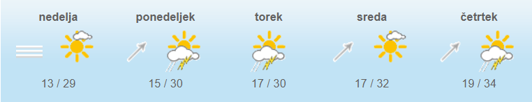 Jutranje temperature bodo od 9 do 15, ob morju okoli 18, najvišje dnevne od 26 do 32 stopinj Celzija.