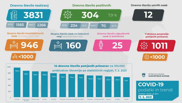 V Sloveniji so včeraj, 7. februarja, opravili 3831 testiranj na koronavirus in potrdili 304 novih okužb, gre za 7,9 odstotni delež okužb.