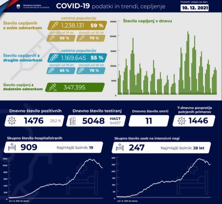 V Sloveniji so včeraj, 10. decembra, opravili 5048 PCR testiranj na koronavirus in potrdili 1476 novih okužb, gre za 29,2-odstotni delež okužb.