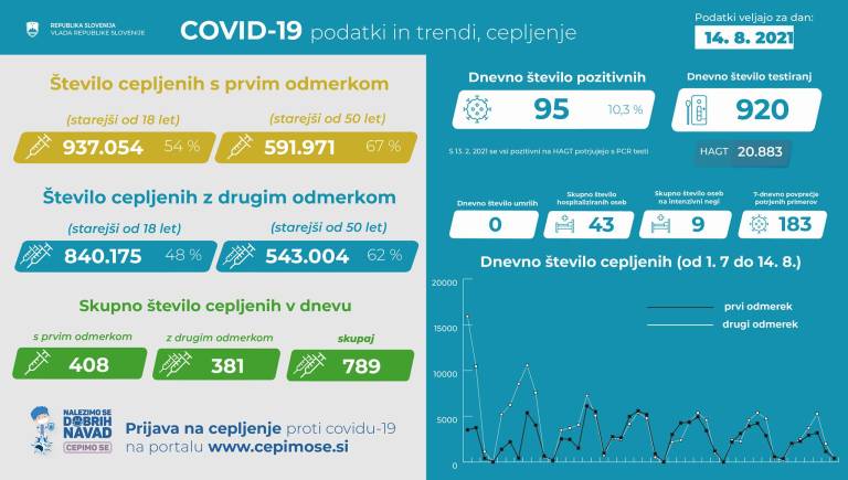 V Sloveniji so včeraj, 14. avgusta, opravili 920 PCR testiranj na koronavirus in potrdili 95 novih okužb, gre za 10,3-odstotni delež okužb.