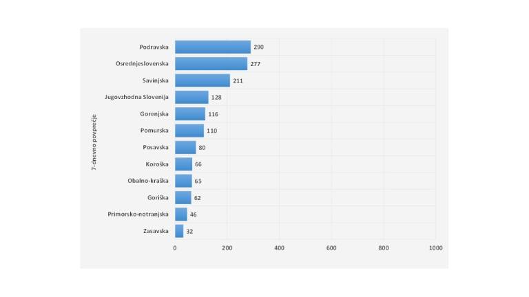 Na prvem mestu je Podravska regija z 290 okuženimi, na zadnjem pa Zasavska, kjer so jih v sedmih dneh potrdili 32.