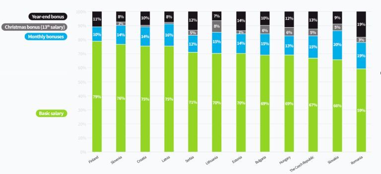 V Romuniji nagrade na primer predstavljajo kar do 41 odstotkov skupnega prihodka vodstvenih delavcev na najvišjih položajih. Najvišji vodstveni delavci najpogosteje prejmejo nagrade ob koncu leta, ki so lahko tudi dvakrat tako visoke kot njihova redna mesečna plača. V vseh državah srednje in vzhodne Evrope nagrade ob koncu leta znašajo v povprečju do ene desetine letnih prihodov.
