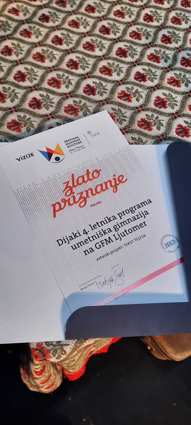 Predstava z naslovom Tekst telesa je bila nagrajena z zlatim priznanjem.