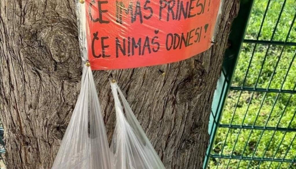 Neznanec je v bližini Doma upokojencev v Olmu v občini Koper na drevo pritrdil napis Če imaš, prinesi, če nimaš, odnesi.
