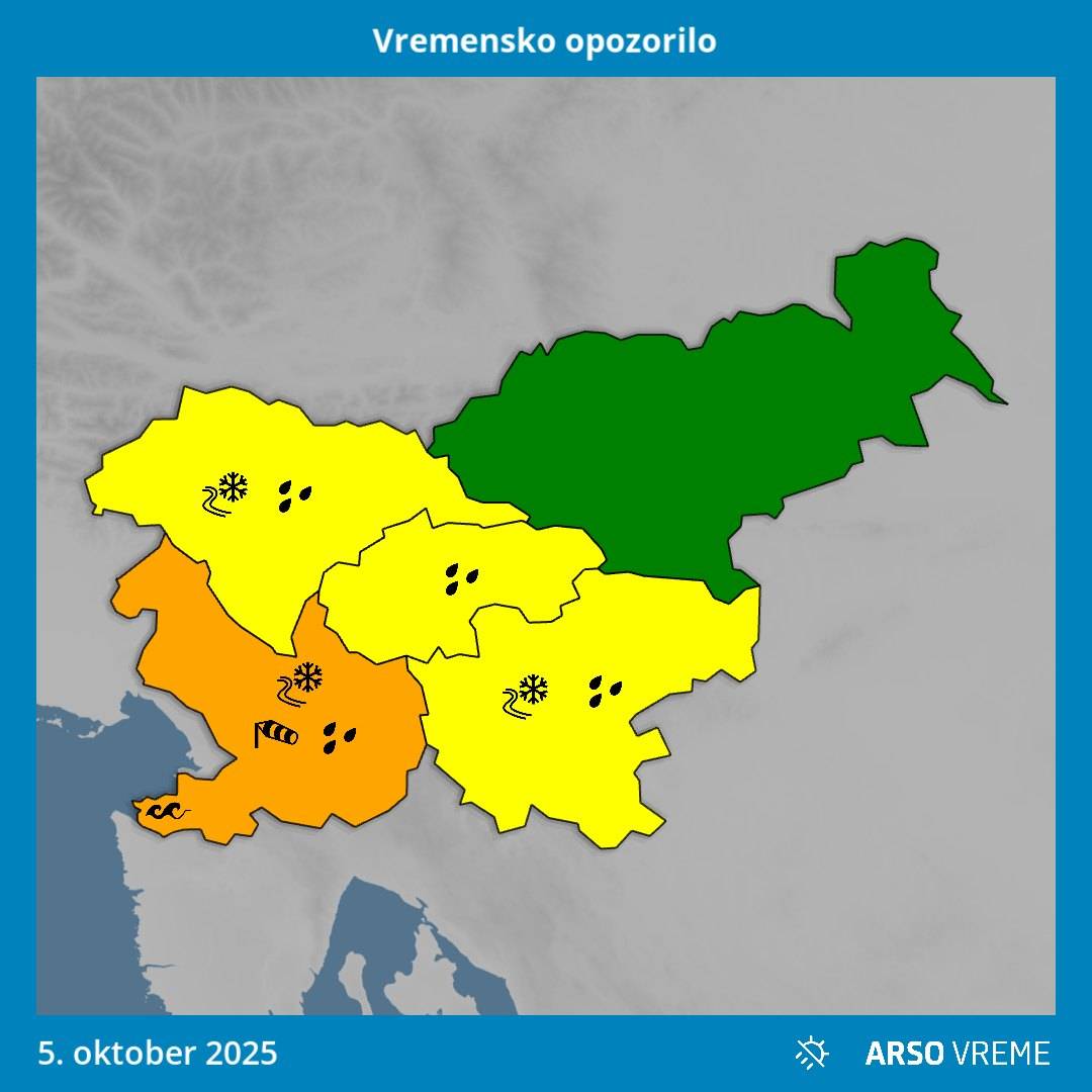 Arso je za danes zaradi prehoda ciklona z izrazito hladno fronto izdal oranžno opozorilo za zahodni in jugozahodni del države. Bodo pa padavine popoldne slabele in od severa ponehale, od severozahoda se bo jasnilo. Burja na Primorskem bo do večera ponehala. Temperature bodo od pet do deset, na Primorskem do 15 stopinj Celzija.