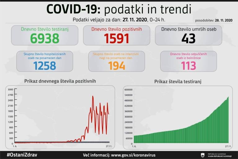 V Sloveniji so v včeraj, 27. novembra, opravili 6938 testiranj na koronavirus in potrdili 1591 novih okužb. To pomeni, da je bil delež pozitivnih testov tokrat 22,82 odstotka.