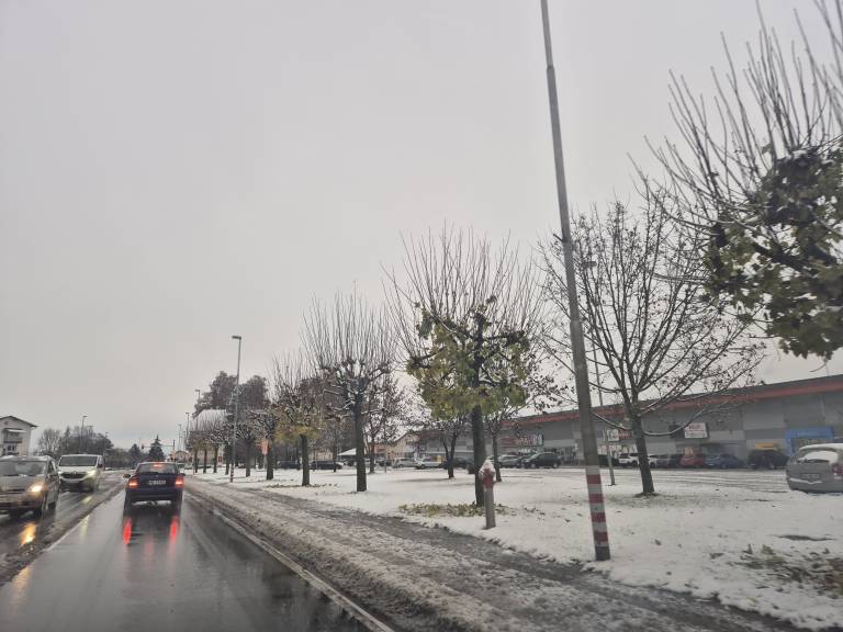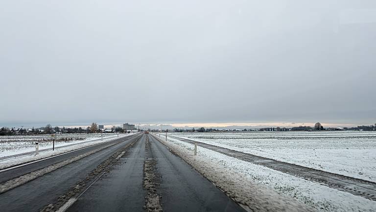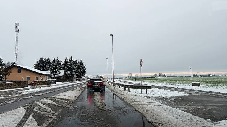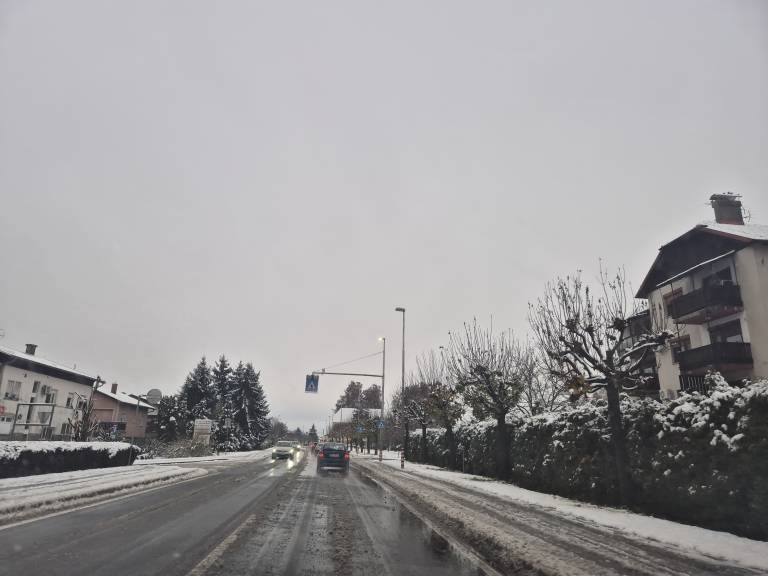 Snežna odeja debela 2 centimetra. So pa komunalci že rano zjutraj letali okoli s snežnim plugom in strugali asfalt.
