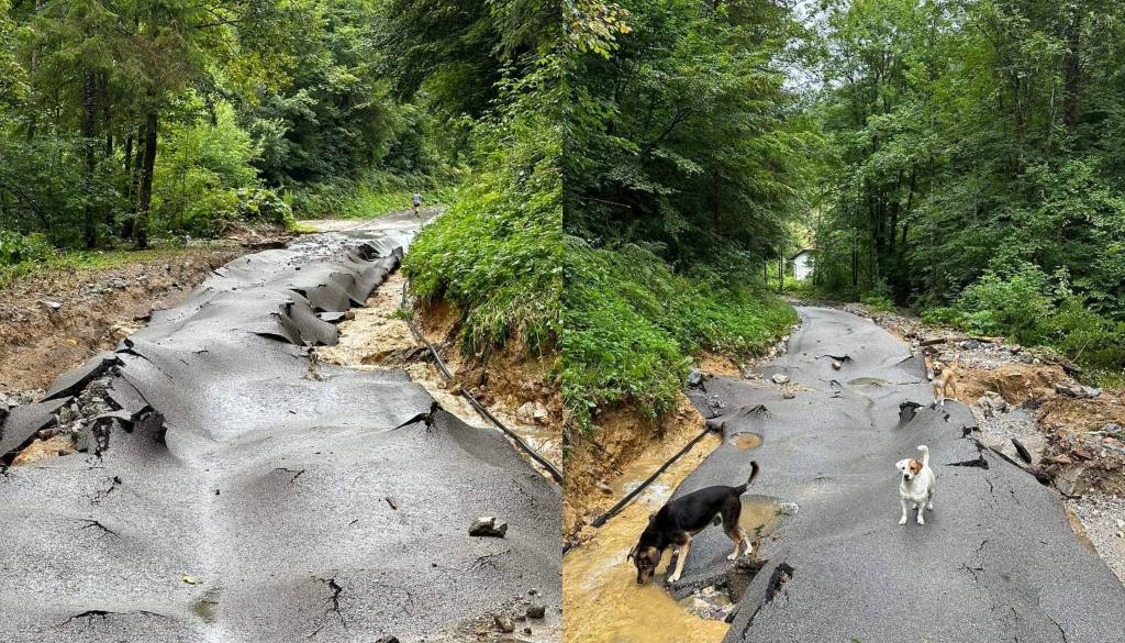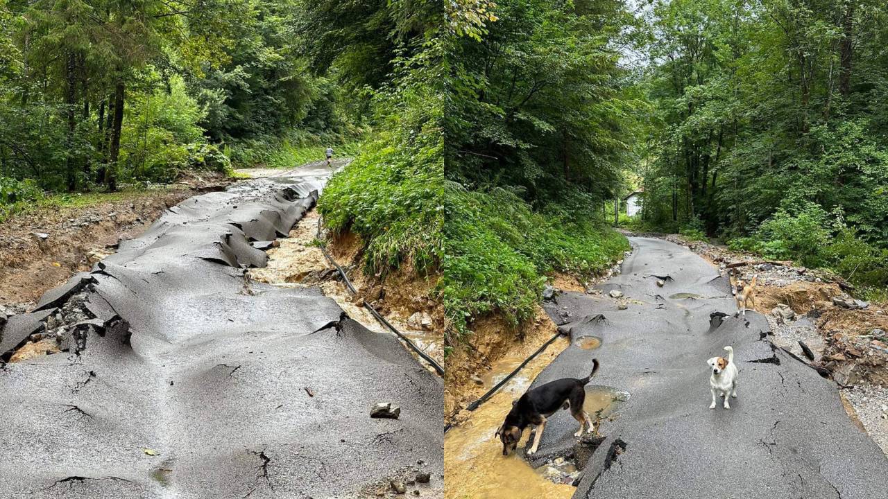 V Polhovem Gradcu so hudourniki uničili cesto, številni so odrezani od sveta.