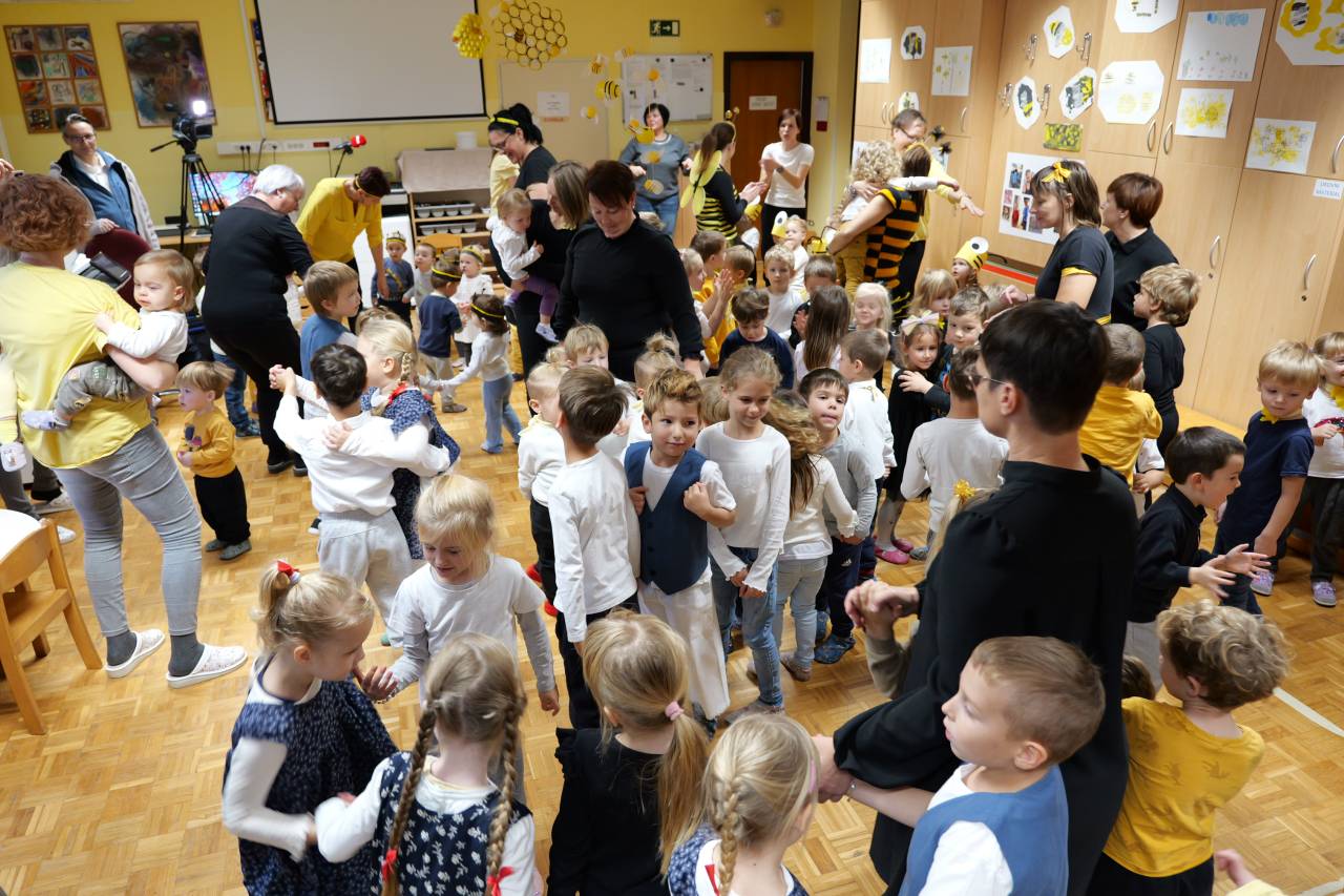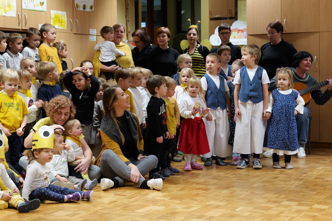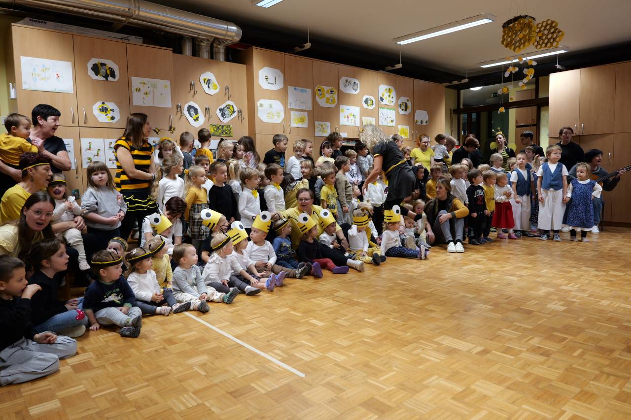 Otroci in vzgojiteljice so se pridružili vseslovenski pobudi petja pesmi Čebelar, ki jo vsako leto organizira Čebelarska zveza Slovenije.