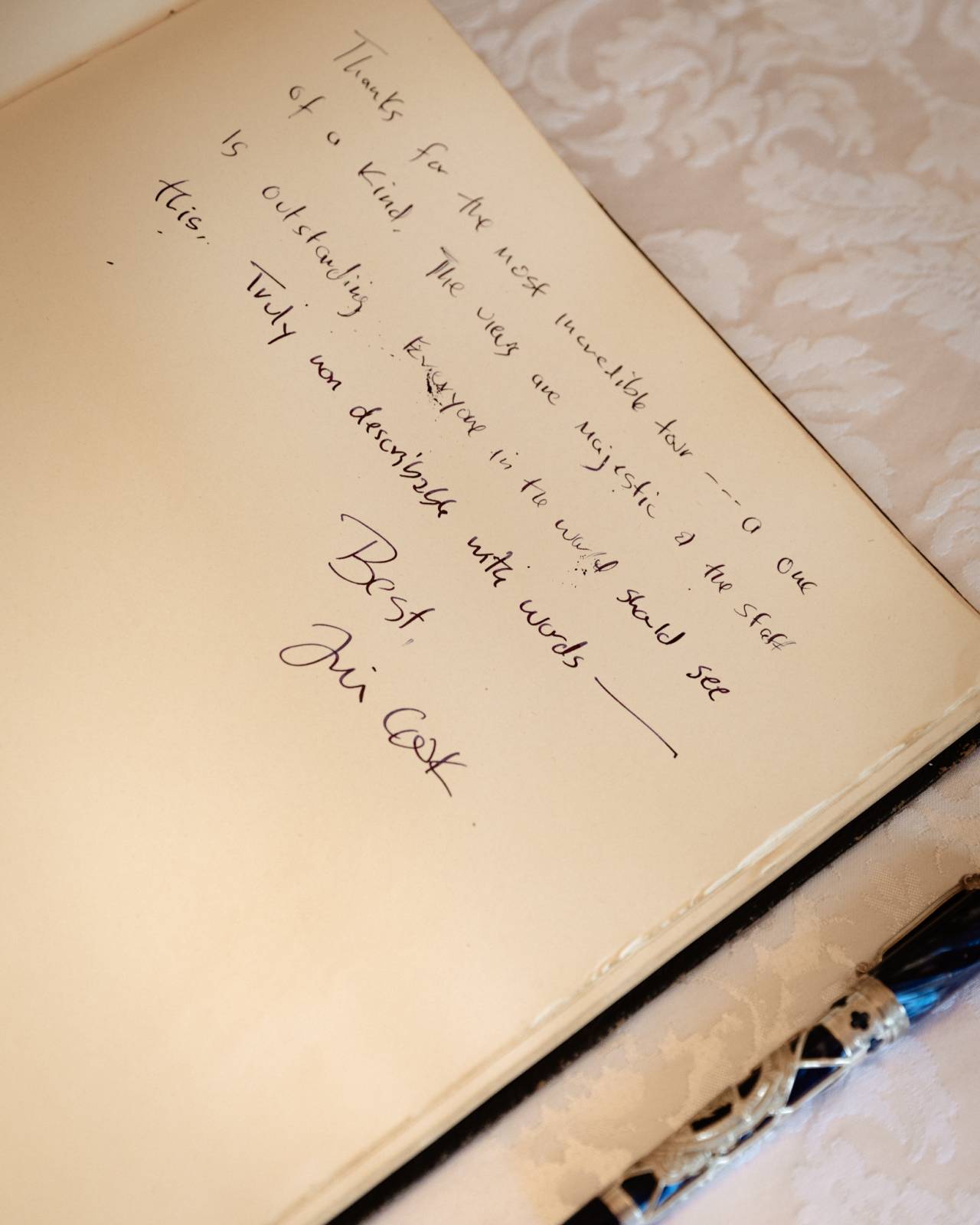 »Hvala za najbolj neverjetno avanturo - resnično edinstveno. Razgledi so veličastni, osebje pa izjemno. Vsakdo na svetu bi moral to videti. Resnično neopisljivo z besedami,« je Cook zapisal v Zlato knjigo obiskovalcev.