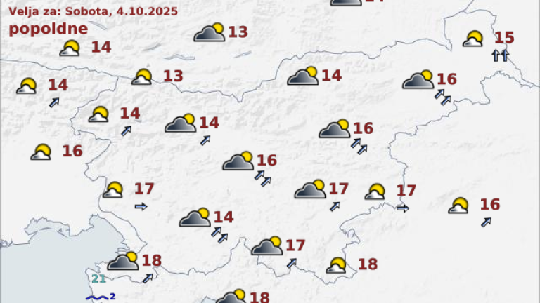 Meteorologi za danes sprva napovedujejo pretežno jasno vreme, čez dan pa bo oblačnost naraščala. Zapihal bo jugozahodni veter, ki se bo zvečer okrepil. Najvišje dnevne temperature bodo od 13 do 18 stopinj Celzija.