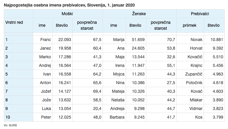 Število imen s frekvenco 20.000 se je zmanjšalo s sedem na tri. Seznama desetih najpogostejših imen sta se spremenila, še vedno pa sta na vrhu Marija in Franc, ugotavlja Statistični urad Republike Slovenije.