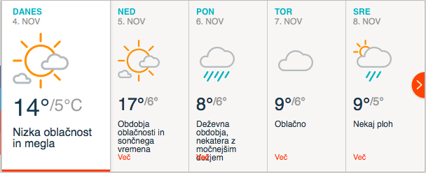 Popoldne bo v vzhodni Sloveniji delno jasno. Drugod bo zmerno do pretežno oblačno, na Primorskem in Notranjskem lahko občasno že rosi ali rahlo dežuje. Ponekod bo pihal jugozahodni veter. Najvišje dnevne temperature bodo od 9 do 15, na Primorskem do 17 stopinj C.