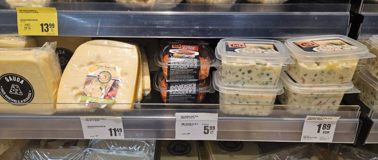 Cene se precej razlikujejo. Tako je ta mesni namaz, ki ga prodaja Hofer, dostopen že za 15,96 evra za kilogram, medtem ko biftek v Mercatorju stane 29,95 evra za kilogram.