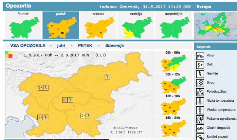 Za petek je za celotno Slovenijo izdan oranžen alarm, kar pomeni, da so lokalno možni močnejši nalivi s točo, močnejši piš vetra in udari strel. Toča lahko poškoduje posevke. Ob hudourniških vodotokih so možne poplave. Udari strel lahko zanetijo požare.