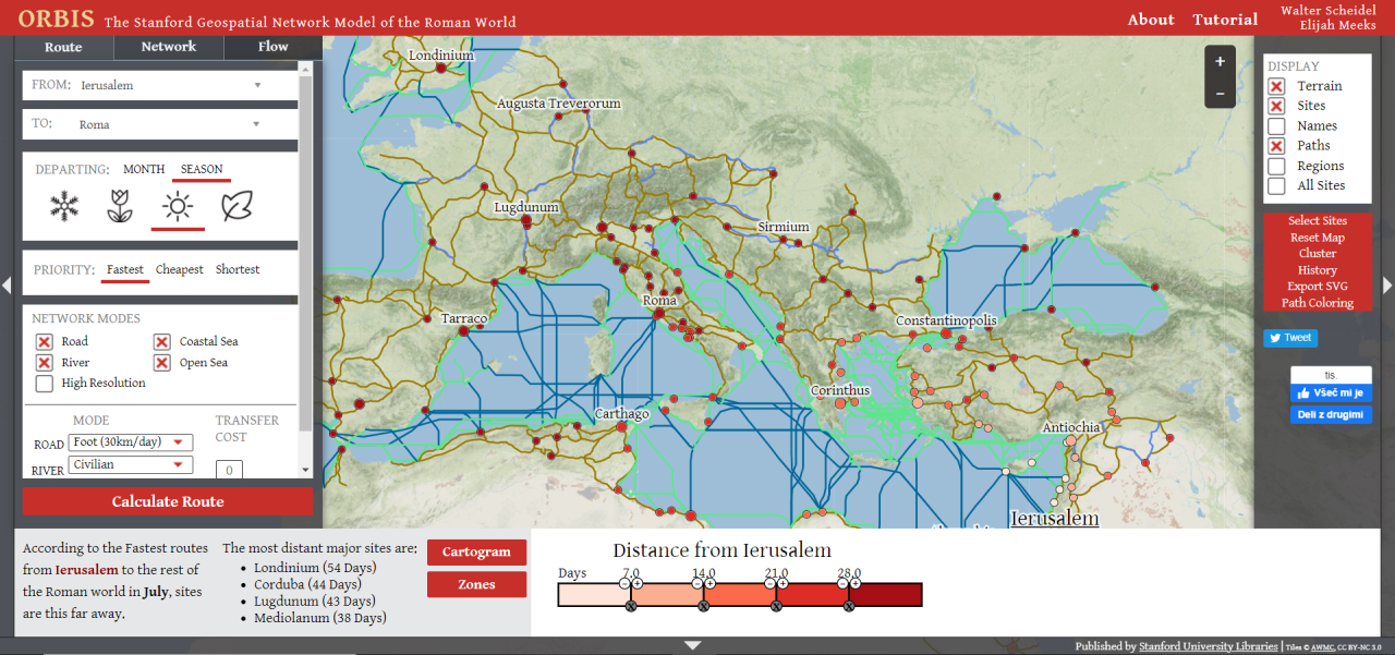Model geoprostorskega omrežja rimskega sveta, ki se imenuje ORBIS, nam omogoča, da preverimo, kako dolgo bi trajalo potovanje od ene do druge lokacije v rimskih časih.