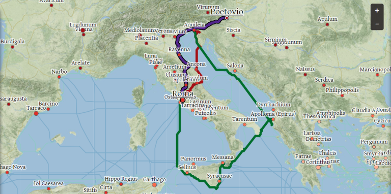 S simulacijo gibanja po glavnih poteh rimskega cestnega omrežja, glavnih plovnih rek in na stotine morskih poti v Sredozemlju, Črnem morju in obalnem Atlantiku nam ta interaktivni model namreč rekonstruira trajanje in finančne stroške potovanja v antiki. V kalkulatorju lahko izberemo tudi način potovanja in letni čas.