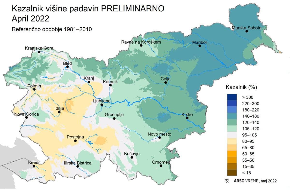 Na državni ravni je kazalnik višine padavin znašal okrog 118 odstotkov, kar uvršča april 2022 med približno 22 najbolj namočenih od leta 1961.