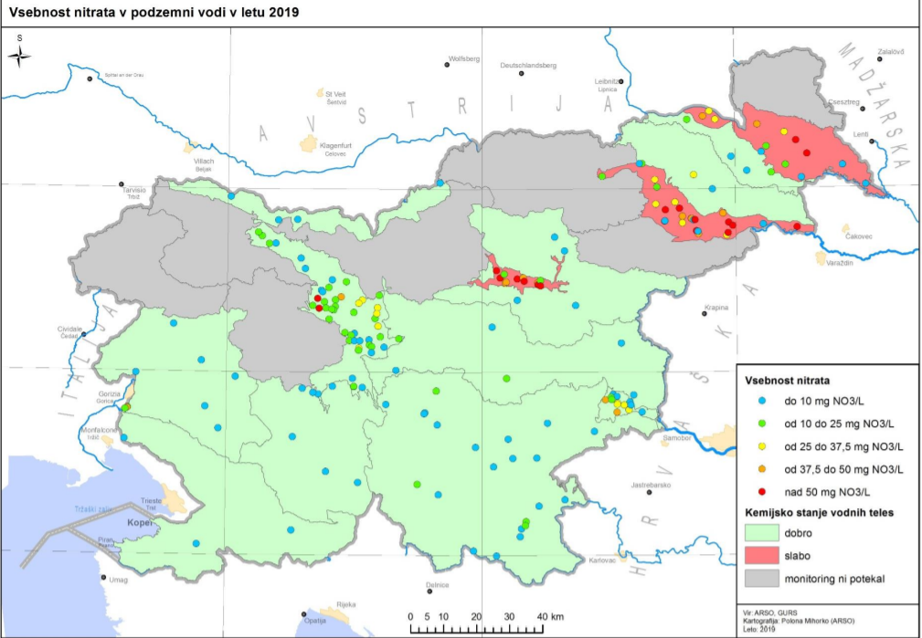 Za tri vodna telesa, Savinjsko, Dravsko in Mursko kotlino je bilo zaradi preseganja standarda kakovosti za nitrat ugotovljeno slabo kemijsko stanje.