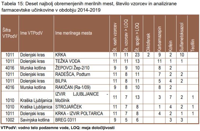 Nekatere spojine se v okolju razgradijo, nekatere pa so obstojne in jih v vodah lahko zaznavamo še mnogo le, so še zapisali. Glede na analizo v letu 2019 so, tako kot pretekla leta, določili največ kofeina, karbamazepina, diklofenaka in sulfametoksazola ter po enkrat propranolol, paracetamol in naproksen.