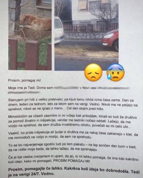 Včeraj je po družbenih omrežjih zaokrožila slika izdelanega in obešenega plakata, ki predstavlja žalostno zgodbo psa iz Nove vasi v Mariboru.