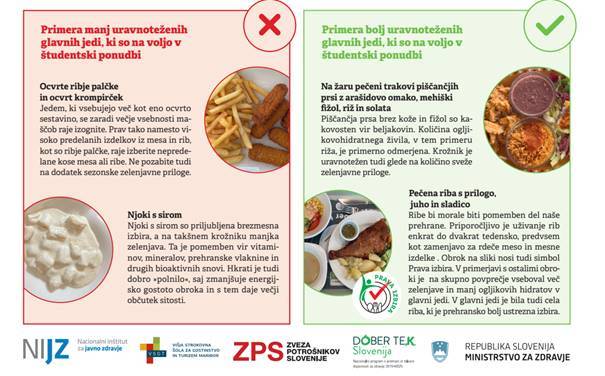 »Zadnji pregled 35 subvencioniranih študentskih obrokov, ki smo ga na Zvezi potrošnikov Slovenije v sodelovanju z Nacionalnim inštitutom za javno zdravje izvedli v začetku septembra 2023, je razkril, da v glavnih jedeh prevladujejo živila z več ogljikovimi hidrati, temu sledijo živila z več beljakovinami, najmanj pa je zelenjave, kar ni skladno s konceptom zdravega in uravnoteženega krožnika.