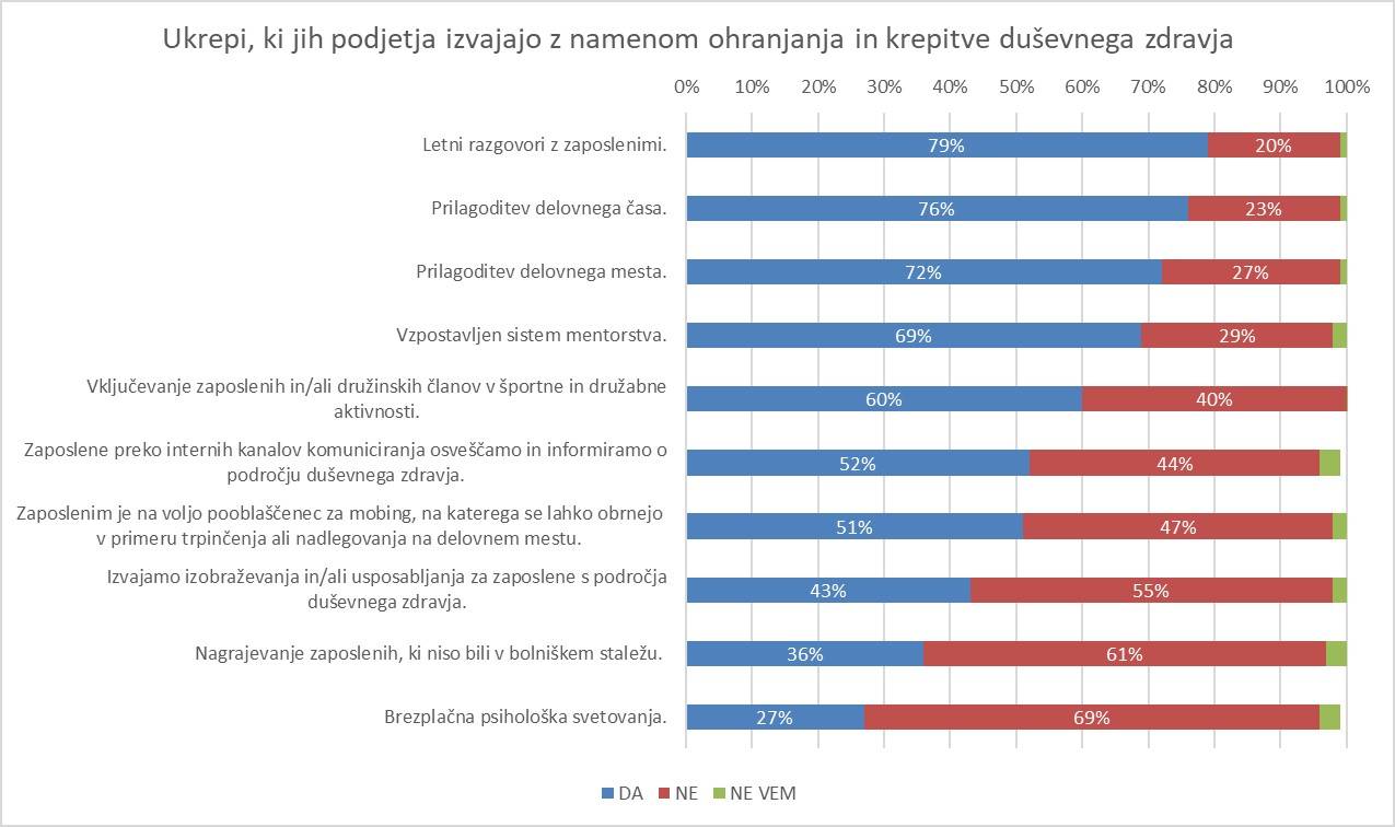 Dve tretjini (66 odstotkov) delodajalcev v okviru programa promocije zdravja na delovnem mestu že načrtujeta ukrepe za ohranjanje in krepitev duševnega zdravja zaposlenih, prav tako podoben delež (65 odstotkov) poroča, da imajo zaposleni možnost sodelovanja pri tem.