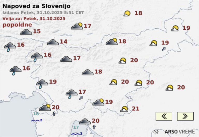 Danes bo pretežno oblačno, ponekod tudi megleno. Čez dan se bo oblačnost od vzhoda tanjšala, na zahodu pa bo ostalo večinoma oblačno, z občasnim rahlim dežjem. Najvišje dnevne temperature bodo med 17 in 21, na severozahodu okoli 15 stopinj Celzija, kažejo podatki Arsa.