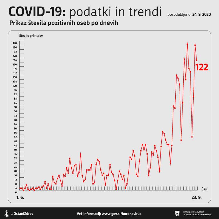 Včera, 23. septembra 2020, so v Sloveniji opravili 2.848 testiranj na novi koronavirus. Potrdili so 122 novih okužb.