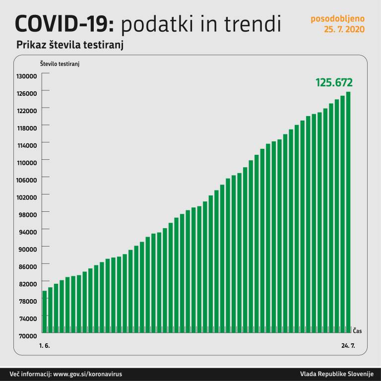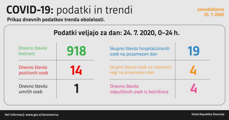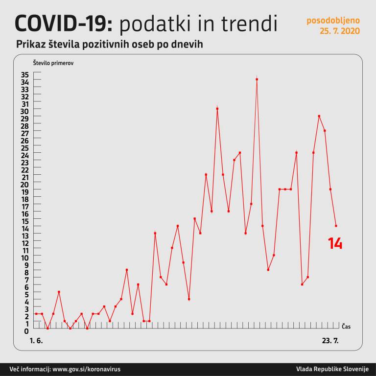 Včeraj, 25. julija, so v Sloveniji opravili 918 testiranj na novi koronavirus. Potrdili so 14 novih okužb. Za primerjavo: dan prej je število novih okužb znašalo 19.