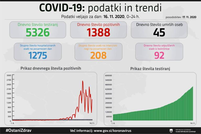 V Sloveniji so v včeraj, 16. novembra, opravili 5326 testiranj na koronavirus in potrdili 1388 novih primerov okužbe, delež pozitivnih je pri tem 26-odstotni.