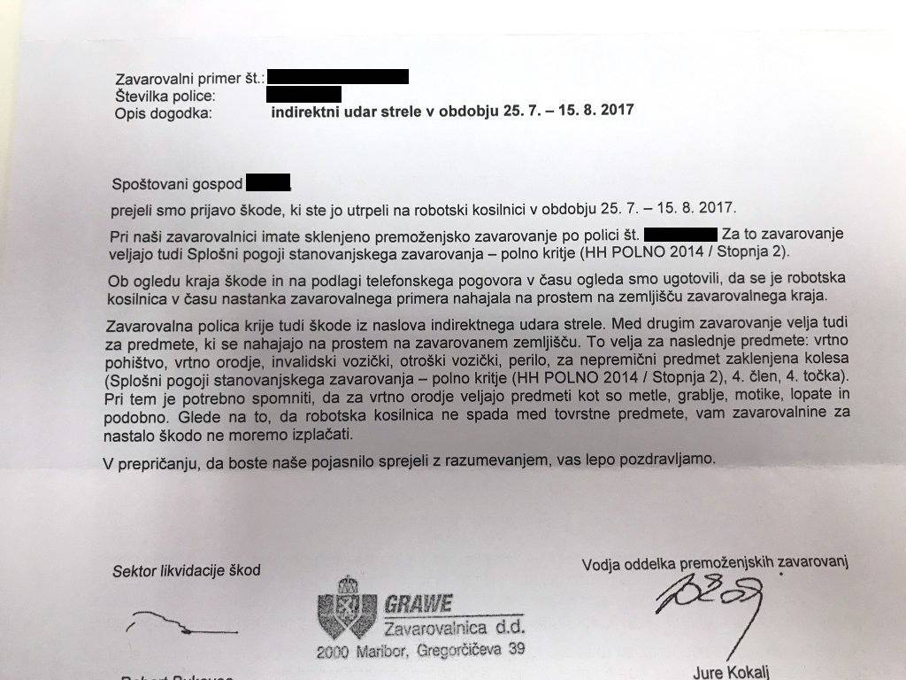 A v zavarovalnici Grawe se očitno z zavarovancem niso strinjali ter njegovo prošnjo zavrnili z argumentom, da robotska kosilnica ni vrtno orodje. Pri tem so zapisali:
