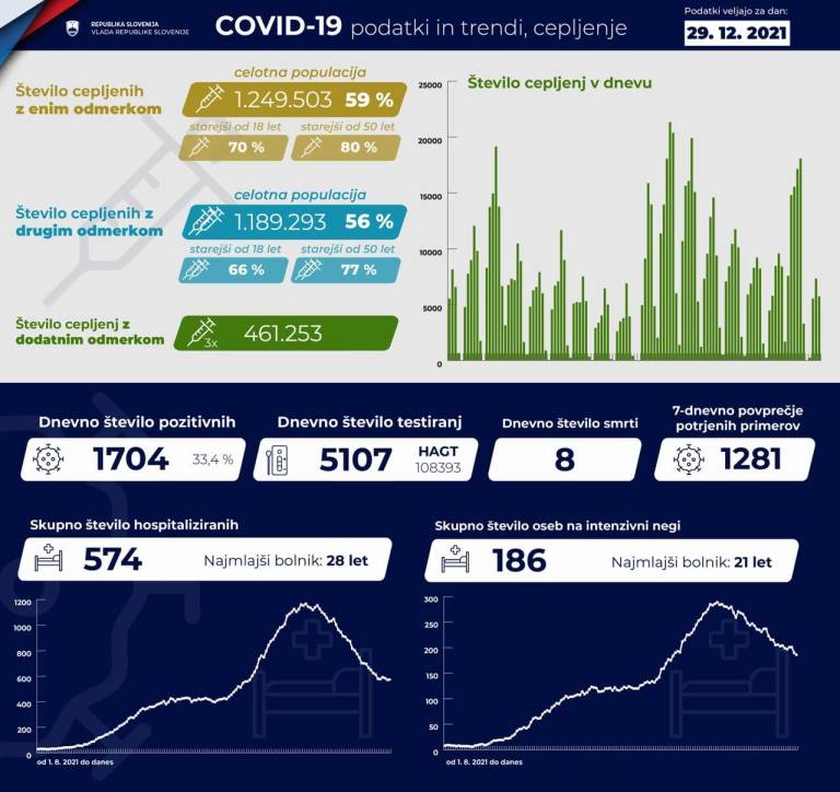 V Sloveniji so včeraj, 29. decembra, opravili 5107 PCR testiranj na koronavirus in potrdili 1704 novih okužb, gre za 33,4-odstotni delež okužb.