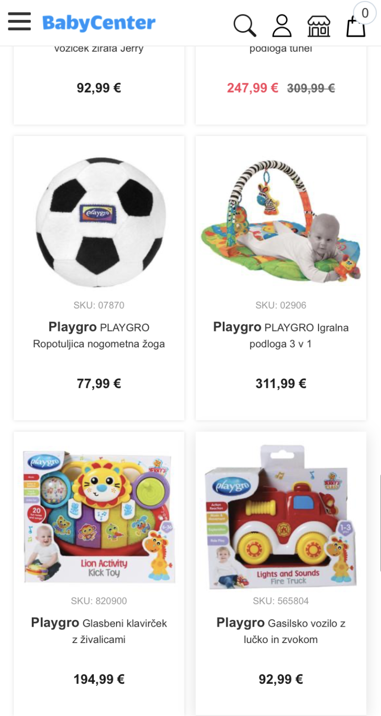 Cene igrač so šle v višave! Tako bi denimo za nihajočo piramido znamke Fisher Price, ki sicer stane okoli osemnajst evrov, morali odšteti okoli sto dvajset evrov, za ropotuljico nogometno žogo sedeminsedemdeset evrov namesto deset, za igralno podlogo, katere redna cena je štirideset evrov, pa čez tristo evrov.