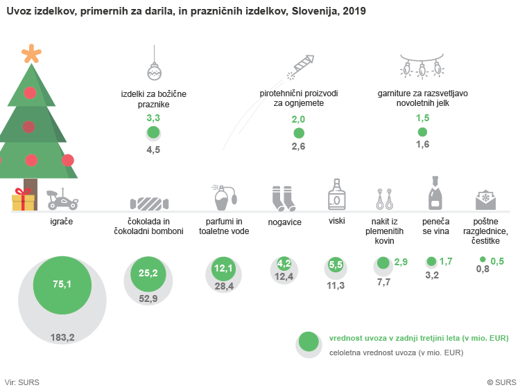 Povečano povpraševanje po izdelkih, ki jih povezujemo z decembrskimi prazničnimi tradicijami, se pozna tudi pri uvozu. V zadnji tretjini leta se namreč poveča uvoz izdelkov, primernih za darila, in izdelkov, s katerimi radi poudarimo praznično razpoloženje.