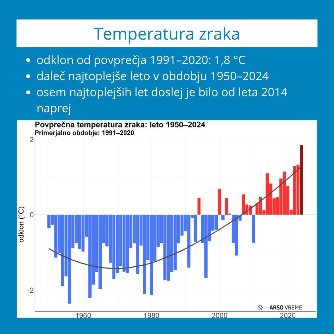 Vremenoslovci pojasnjujejo, da je odklon temperature zraka od povprečja primerjalnega obdobja 1991–2020 na državni ravni znašal 1,8 stopinjo Celzija, zaradi česar je leto 2024 najtoplejše od začetka primerljivih podatkov, to je od leta 1950.