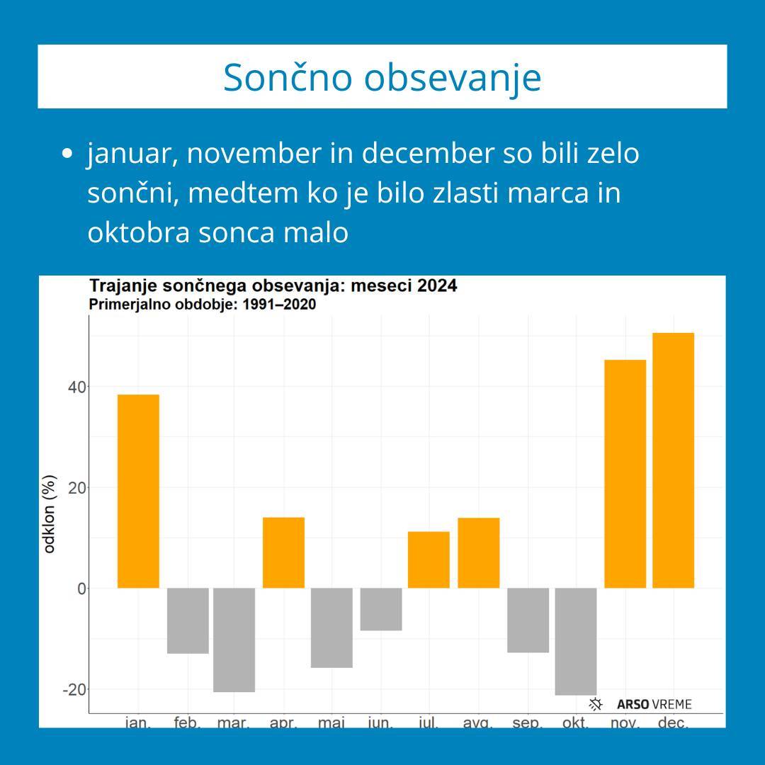 Leto 2024 je bilo na ravni Slovenije normalno osončeno, s kazalnikom trajanja sončnega obsevanja na državni ravni 102 odstotkov, kar leto uvršča na približno 18. mesto najbolj osončenih let v obdobju 1961–2024.