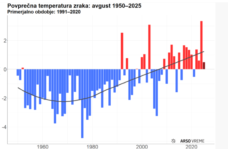Povprečna temperatura je bila za 0,5 stopinje Celzija nad povprečjem (1991–2020), kar avgust 2025 uvršča med dvajset najtoplejših od leta 1950. Najbolj vroč v tem obdobju ostaja avgust 2024 (+3,3 stopinje Celzija).