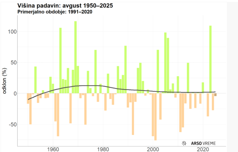 Po skupni statistiki temperature in padavin je bil avgust 2025 najbolj podoben avgustu 2009 – oba meseca sta bila primerljivo namočena, a z različno prostorsko razporeditvijo padavin.