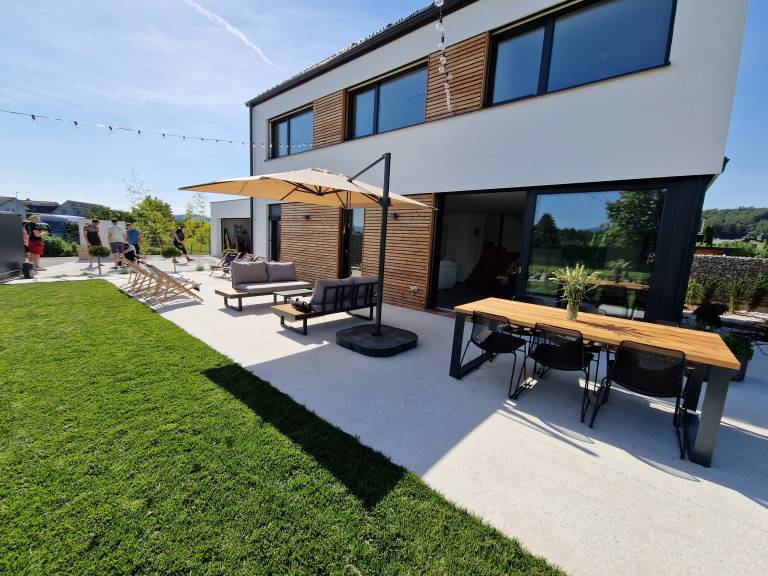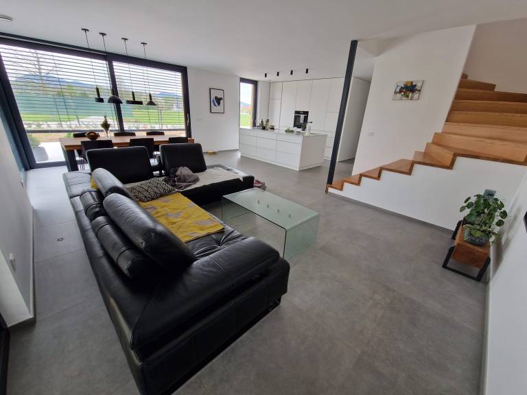 Hiša je bila razvita z mislijo na energetsko varčnost, krasi pa jo odprto zasnovani bivalni prostor v pritličju, ki združuje kuhinjo z jedilnico in dnevno sobo.