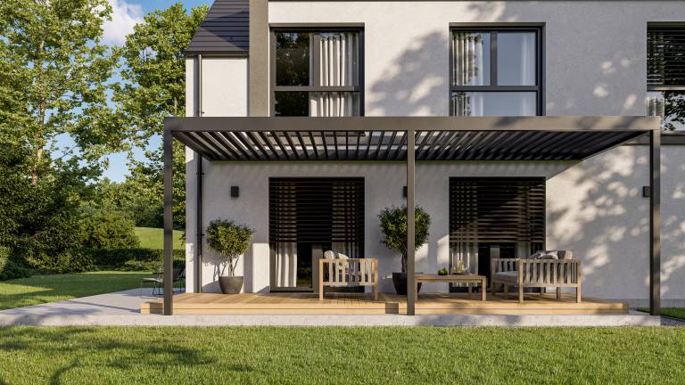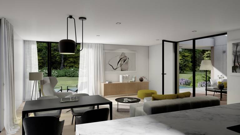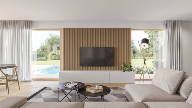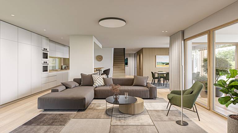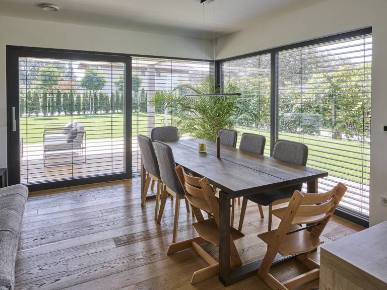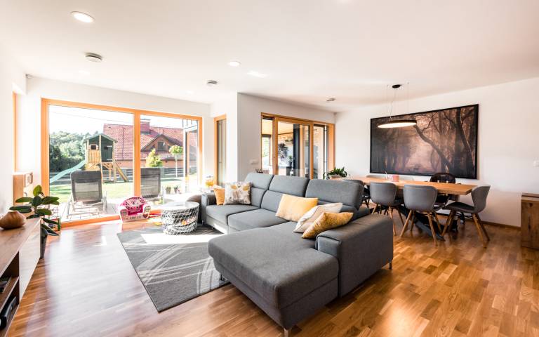 Poudarjeno komfortna dnevna soba, jedilnica in kuhinja omogočajo družabna srečanja in druženja, ki se z lahkoto nadaljujejo tudi v zavetju zunanjega nadstreška.